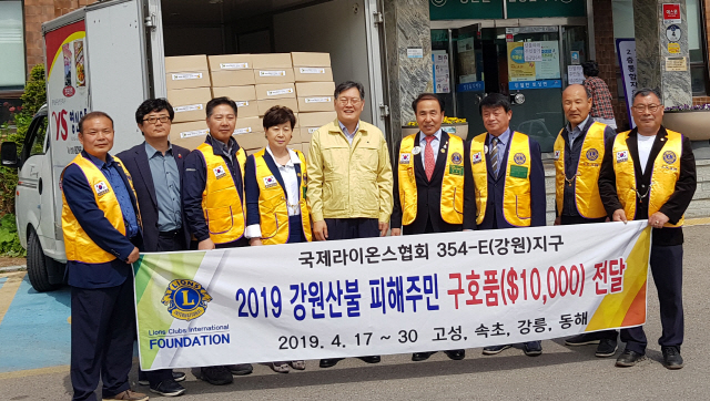 국제라이온스협회 354-E 강원지구(총재 박봉교)회원들은 1일 산불피해현장인 강릉, 동해, 속초, 고성을 찾아 이재민들에게 국제라이온스협회 LCIF로부터 지원받은 긴급교부금 1만불의 생필품을 전달하고 강원지구 회원들이 모금한 1650만원의 성금을 주민들에게 지원했다.