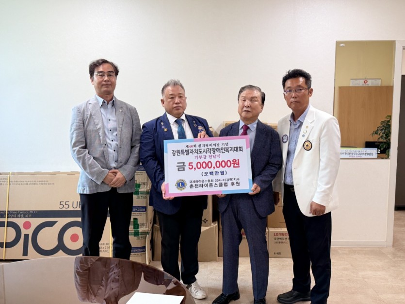 춘천라이온스클럽 시각장애단체 봉사기금 기탁 페이지 정보 작성자 춘천 댓글 0건 조회 725회 작성일 25-11-30 00:09 본문 2025년 10월 1일 춘천라이온스클럽은 강원특별자치도 시각장애인연합회에 시각장애인용 전자기기 및 복지물품 구매비용으로 500만원을 기탁하였습니다. 목록 이전글춘천라이온스클럽 시각장애인단체 행사 봉사 25.11.30 다음글춘천라이온스클럽 어부바봉사단(배식 및 설겆이봉사) 25.11.30