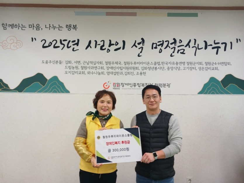 철원두루미 라이온스클럽 설명절 나눔행사 페이지 정보 작성자 철원두루미 댓글 0건 조회 1,371회 작성일 25-01-23 20:09 본문 강원특별자치도 장애인복지관 와수분관 설 명절 음식 만들기 행사에 참가하였습니다. 목록 이전글원주제일라이온스클럽 지역아동센타 봉사 25.01.24 다음글원주백년라이온스클럽 봉사활동 - 원주 밥상공동체 어르신 배식및 식당청소 1월 4회 25.01.21