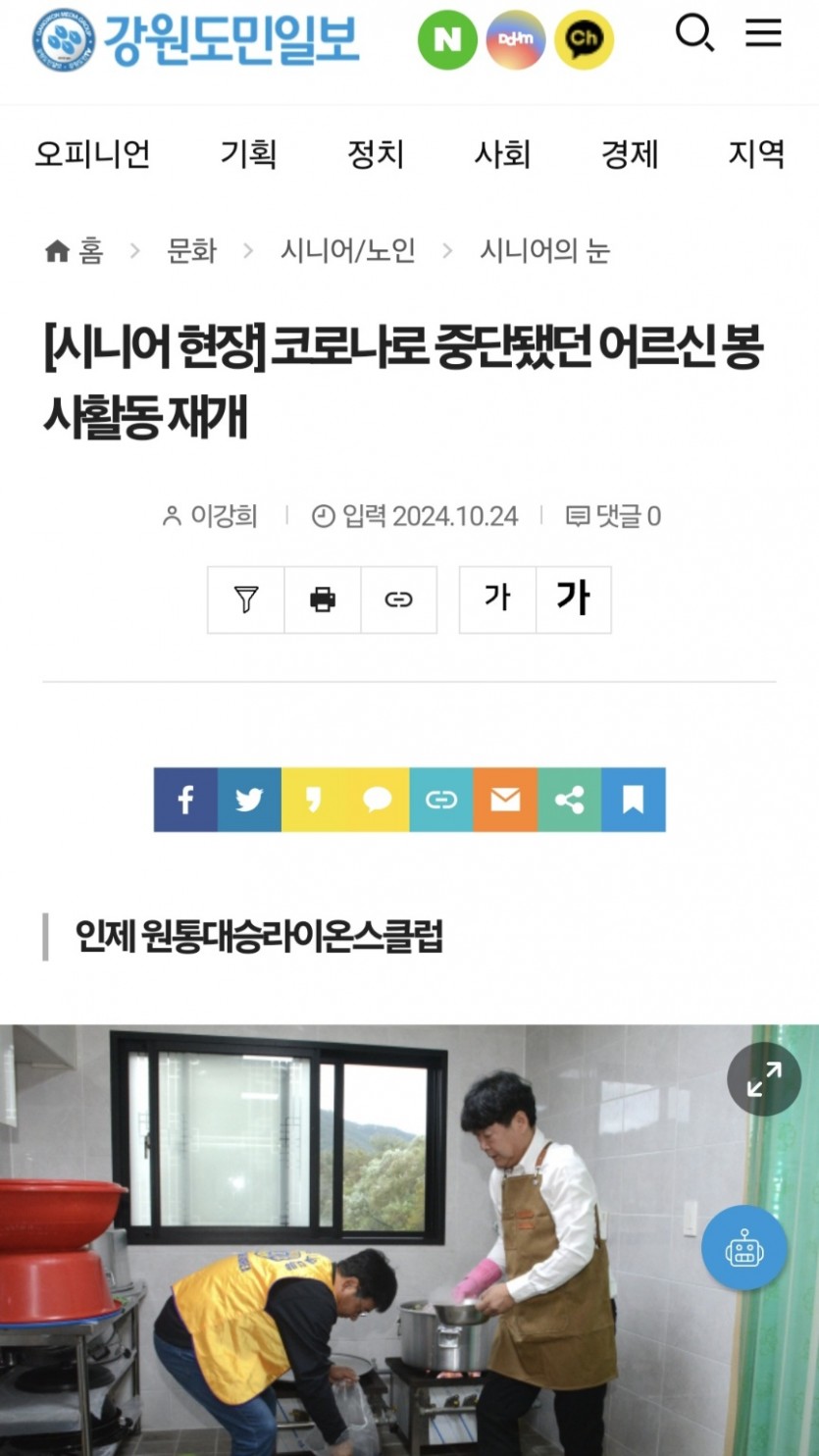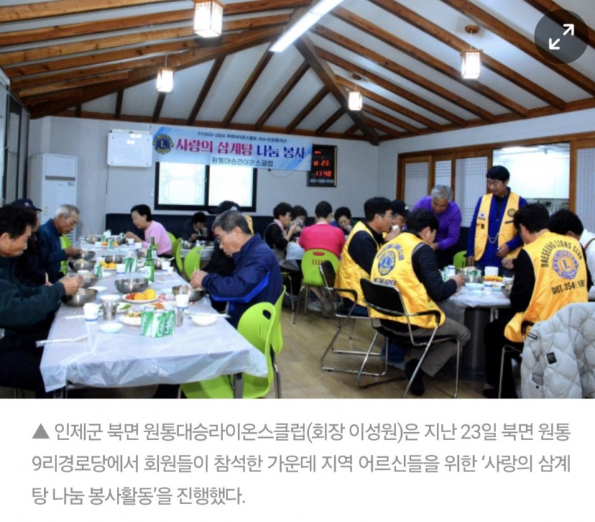 원통대승라이온스클럽 삼계탕 봉사활동(원통9리경로당) 페이지 정보 작성자 원통대승 댓글 0건 조회 1,528회 작성일 24-12-16 18:25 본문 원통9리 경로당 25명 삼계탕 봉사활동 목록 이전글강릉라이온스클럽 김장김치및전기담요 나눔행사 24.12.17 다음글강릉라이온스클럽 24.12.16