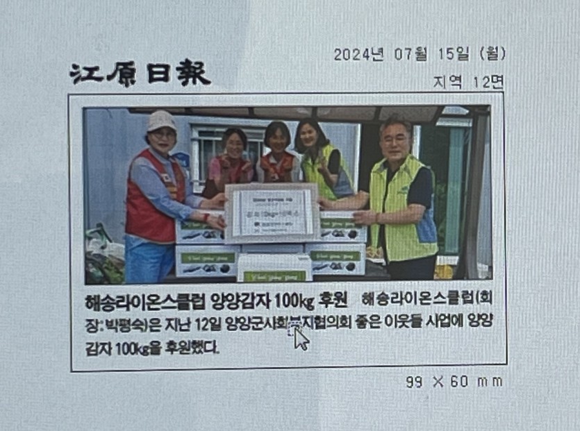 양양 해송클럽 감자100kg 지역사회 이웃돕기 기탁 페이지 정보 작성자 양양해송 댓글 0건 조회 1,876회 작성일 24-07-19 21:50 본문 양양 해송클럽은 지역 농가의 일손을 돕고 감자 100kg(30만원)을 구입하여 지역사회 어려운 이웃을 위해 쓰여지도록 기탁 하였습니다. 목록 이전글7월 14일 설악산 반달곰 동상 정비 및 플로킹 24.07.25 다음글원주백년라이온스클럽/매주월요일 3명씩 4회 어르신 배식및 식당청소 24.07.19