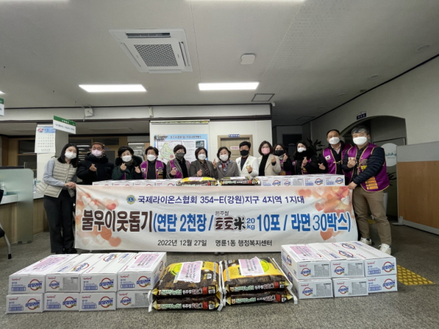 국제라이온스협회354-E(강원)지구 4지역 1지대(위원장:곽매홍)는 지난 27일 명륜1동 행정복지센터에서 250만원 상당의 연탄 2,000장과 토토미 20㎏ 10포, 라면 30상자를 후원했다.