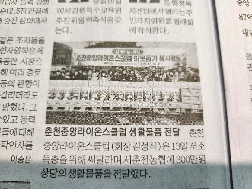 12월13일 불우이웃돕기 행사 페이지 정보 작성자 춘천중앙 댓글 0건 조회 2,877회 작성일 22-12-14 15:14 본문 2022년12월13일 저소득층을 위해 써달라며 클럽회원 20여명은 자매결연 맺은 서춘천농협에게 300만원 상당의 생필품 전달했읍니다. 목록 이전글12월11일 필리핀 해외봉사 22.12.14 다음글정선라이온스클럽 보청기사업 및 장학사업 22.12.09