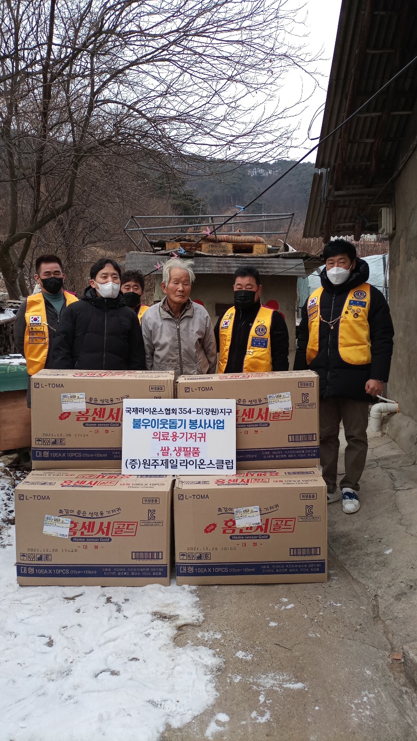 원주제일LC불우이웃돕기 봉사사업 페이지 정보 작성자 원주제일 댓글 0건 조회 3,755회 작성일 22-01-19 16:03 본문 2022년 1월 19일(수) 원주제일LC 불우이웃돕기 봉사사업으로 귀래 안영대 할아버지댁에 의료용기저귀,쌀,종량제봉투를 전달하였다 목록 이전글[춘천명동클럽] 12월 부식조달봉사 22.01.20 다음글강릉 백일홍라이온스클럽 주문진 배식봉사 실시 22.01.19