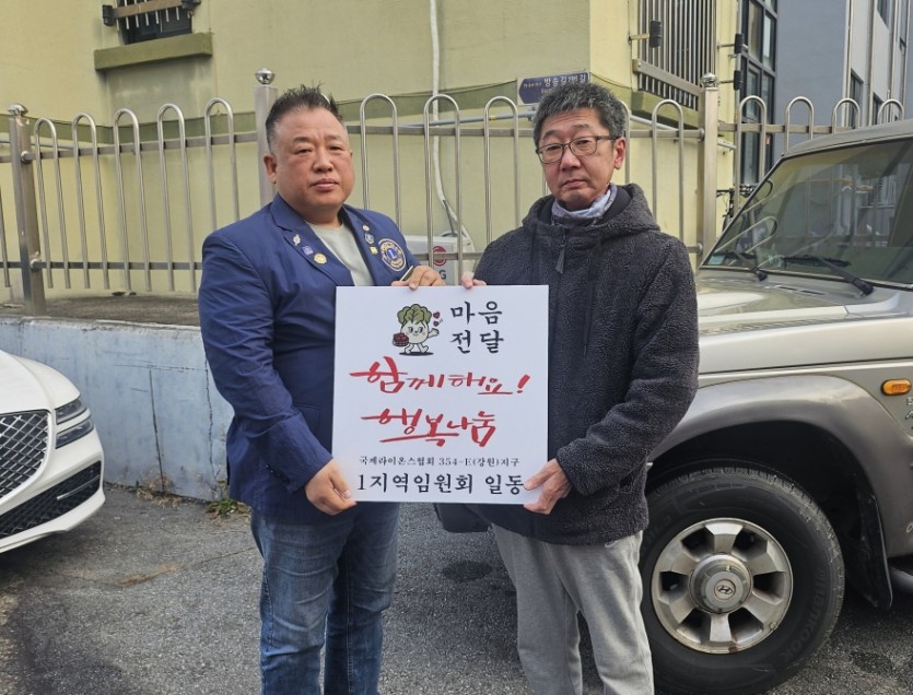 1지역 홍성한 부총재와 임원들이 지난 2025년 11월 15일 직접 재배한 배추를 판매한 수익금을 2025년 12월 10일 불우이웃성금으로 가정형편이 좋지않은 네가구에 1지역 부총재 홍성한L과 춘천클럽 회장겸 1지역 사무국장 심헌용L, 낙원클럽 회장 황오남L, 1지역 의전분과위원장 박미경L과 함께 전달하였습니다.