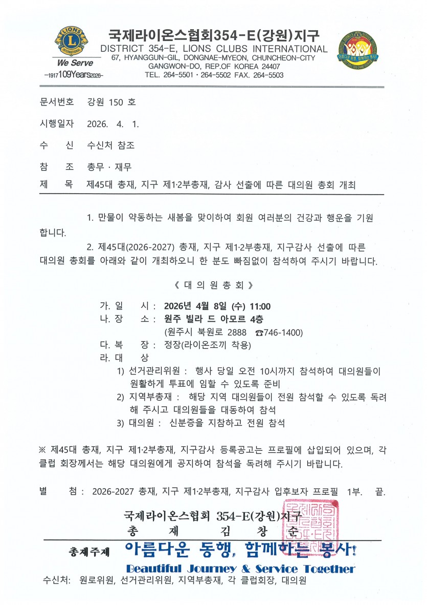 제45대 총재, 지구 제1․2부총재, 감사 선출에 따른 대의원 총회 개최 페이지 정보 작성자 최고관리자 댓글 0건 조회 154회 작성일 26-04-01 15:51 본문 제45대 총재, 지구 제1․2부총재, 감사 선출에 따른 대의원 총회 개최 목록 다음글2026-2027 총재, 지구 제1,제2부총재, 지구감사 입후보 등록 결과 안내 26.03.24
