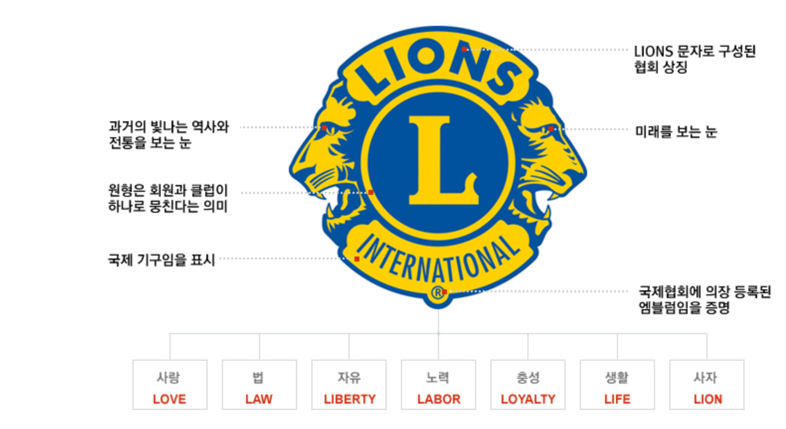국제라이온스협회를 대표하는 사자는 용기, 강인함, 활동성, 성실함 등을 상징하며 인도주의적 봉사활동을 전개하기 위한 기본 요소를 나타낸다. 중앙의 대문자 “L” 은 비단 사자 (Lion) 의 머리글자일 뿐 아니라 사랑 (Love), 자유 (Liberty), 법 (Law), 노력 (Labor), 충성 (Loyalty), 생명 (Life) 을 의미한다. “L” 을 둘러싼 원은 회원과 클럽 , 지구가 하나로 화합하자는 의미이며 , 상단의 “Lions” 와 하단의 “International” 은 각각 협회의 명칭과 국제조직임을 나타낸다. 양 옆을 응시하고 있는 사자의 얼굴은 과거를 돌아보고 미래를 내다보며 도움의 손길을 필요로 하는 곳을 찾아 봉사의 영역을 확대해 나가자는 의미이다.